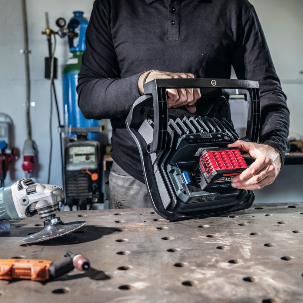 Kraftfull 10000 lumen strålkastare. Kompatibel med METABO/CAS batterisystem 12V 4,0 Ah - 18V 5,2 Ah och alla andra 18V batterier från ledande elverktygsmärken genom att använda Scangrip Connector. Dessutom kan Scangrip Power Supply användas för direkt ström vilket ger obegränsad tillgång till ljus. Lampan har även ett internt back-up batteri som säkrar 1 extra timme vid 1000 lumen. Bluetooth ljusstyrningsapp gör det möjligt att tända/släcka och styra upp till fyra arbetsljus via en mobil enhet. Display för batterikapacitet och lumennivå, Levereras med en inbyggd powerbank. Med bärhandtag och stöd för flexibel positionering och direkt montering på Scangrip Tripod. Tillverkad i robust pressgjuten aluminium, resistent mot starka slag, stötar och vibrationer.