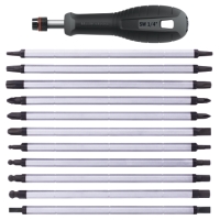 Set med långa bits och handtag i ett praktiskt tygfodral. Utvecklat för professionellt bruk tillsammans med hantverkare. Längden på bitsen kan justeras genom att de skjuts in i handtaget. Innehåller spårbits 4, 5.5 och 6.5, PH 1, 2 och 3, PZ 1 och 2, insex med kulspets 3, 4, 5 och 6 mm samt TORX T10, 15, 20, 25, 30 och 40. Ergonomiskt gummerat handtag för säkert grepp Designad för kraft och precision Standard 1/4 bitshållare med snabblåsning Handtag med rullstopp och upphängningshål 12 delar