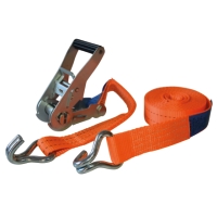 Tvådelat spännband med krokar. Brottsstyrka 2500 kg. Surrningsstyrka 5000 kg. LC 1250 daN. Enligt standard EN 12195-2.