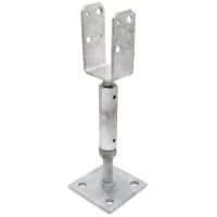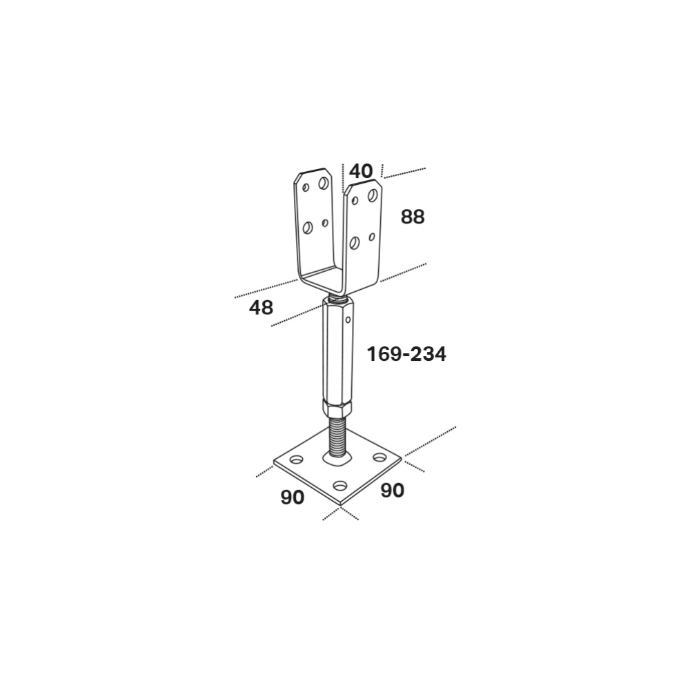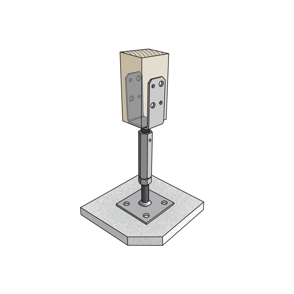 Stolphållare CSAF är justerbar i höjd med hjälp av en vänster-/högergängad långmutter. Används för fastsättning i betong vid infästning av stolpar, till exempelvis staket, pergola och carport. För icke bärande konstruktioner. För fastsättning används ankarspik 4,0 eller ankarskruv 4,8. Till bulthålen används M8, M10 bultar.