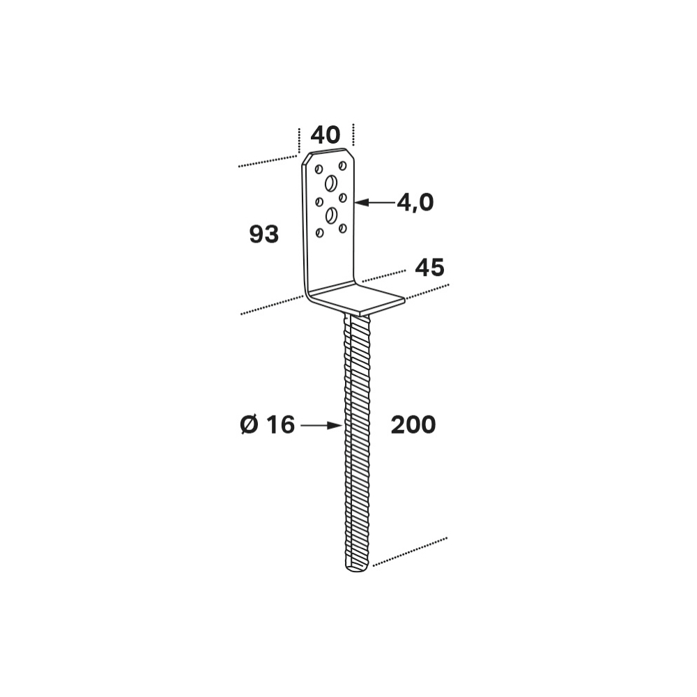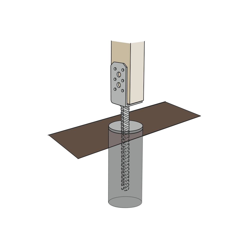 Stolphållare PSL används för ingjutning i betong vid infästning av stolpar, till exempelvis staket, pergola och carport. Avståndet från den vågräta plattan till betongöverkanten får ej överstiga 50 mm. Armeringsjärnets längd är 200 mm. Till bulthålen används M8, M10 bultar. Stolphållarens diameter är Ø 16 mm. Material: 4 mm stålplåt varmförzinkad efter svetsning Bulthål: Ø 9,0 mm, Ø 11,0 mm