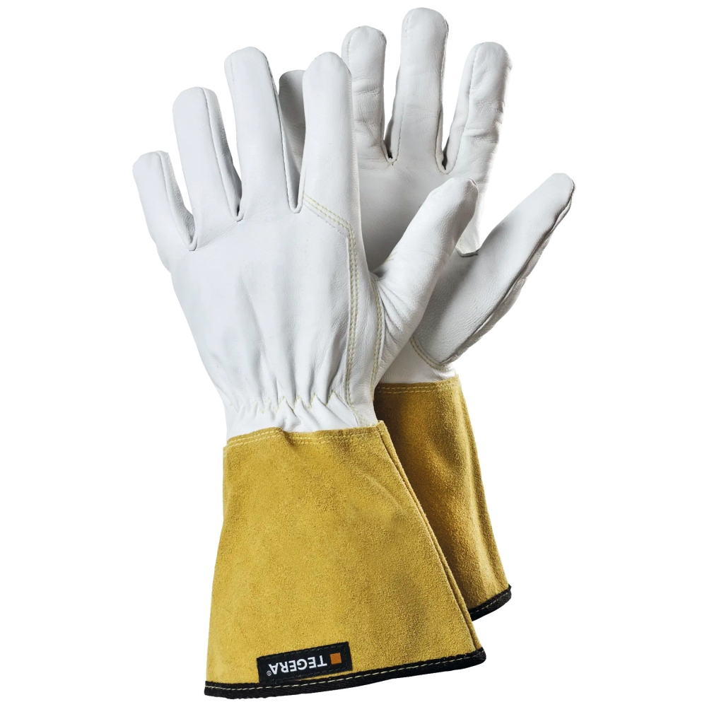 Värmeskyddande handskar, svetshandskar. Högkvalitativ läderhandske med utmärkt komfort, flexibilitet och sömmar i Kevlar. Lång manschett ger extra skydd mot stänk. Elastisk handled för bättre passform, ofodrad för extra känsla och precision.