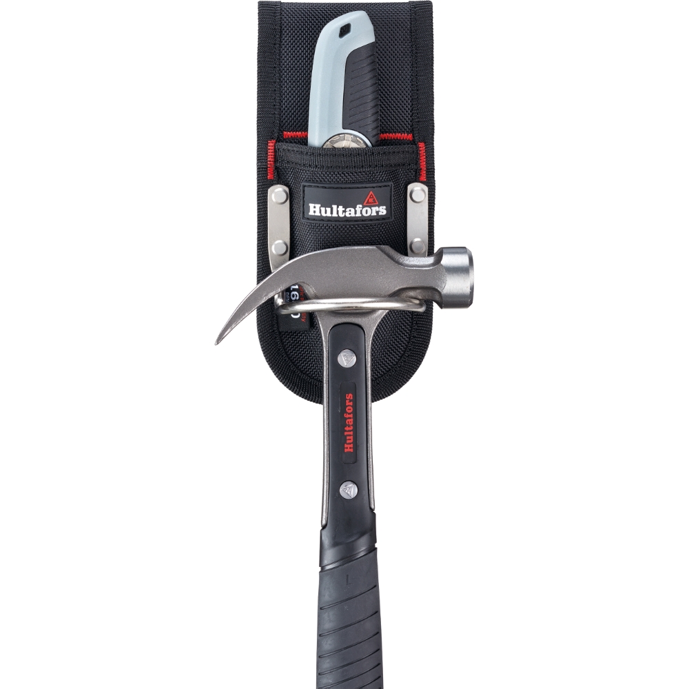 Verktygs- och hammarhållare. Mer än en hammarhållare. Verktygshölster med en kraftig hammarhållare i metall och en ficka för universalknivar, tänger eller andra små verktyg som du alltid vill kunna ha nära till hands.